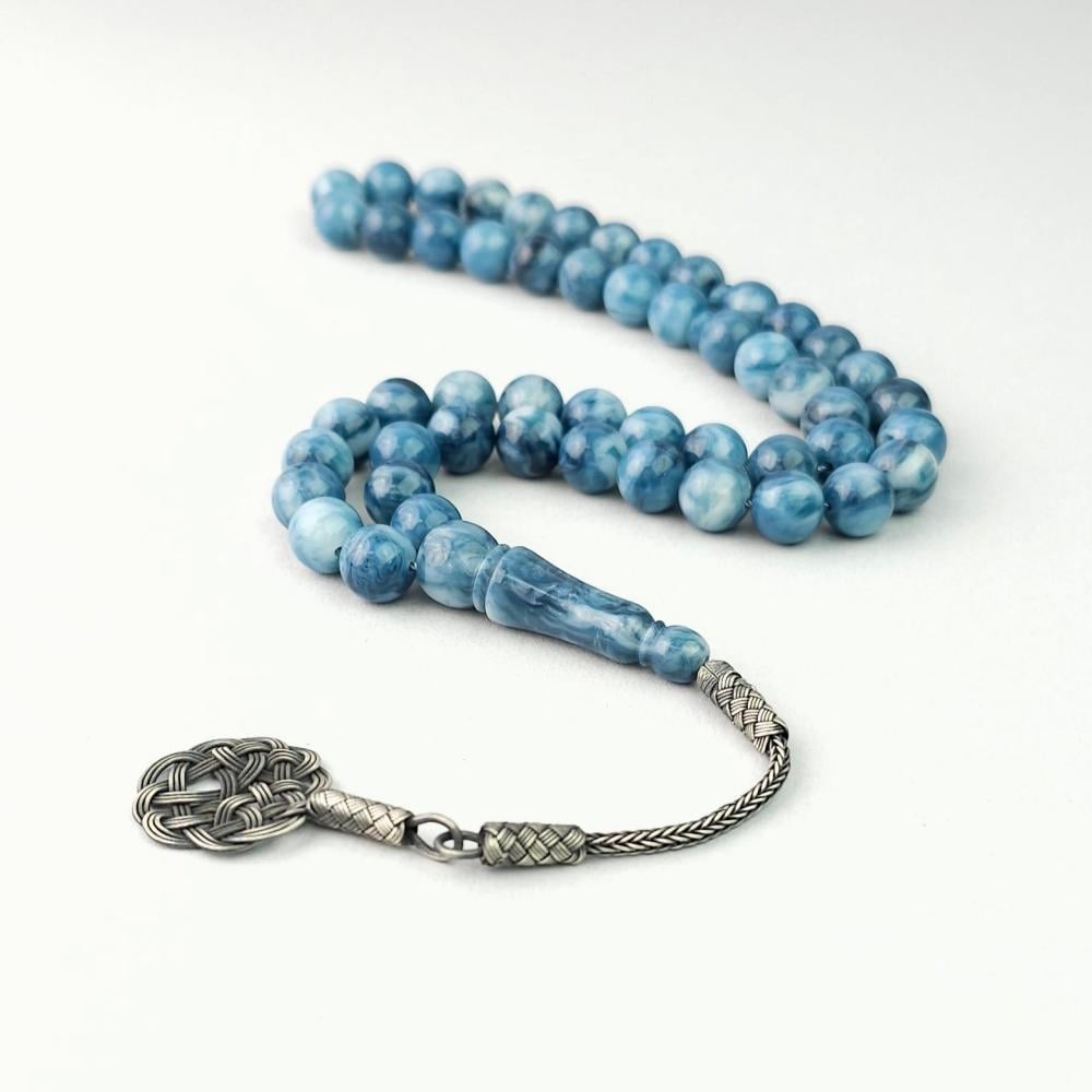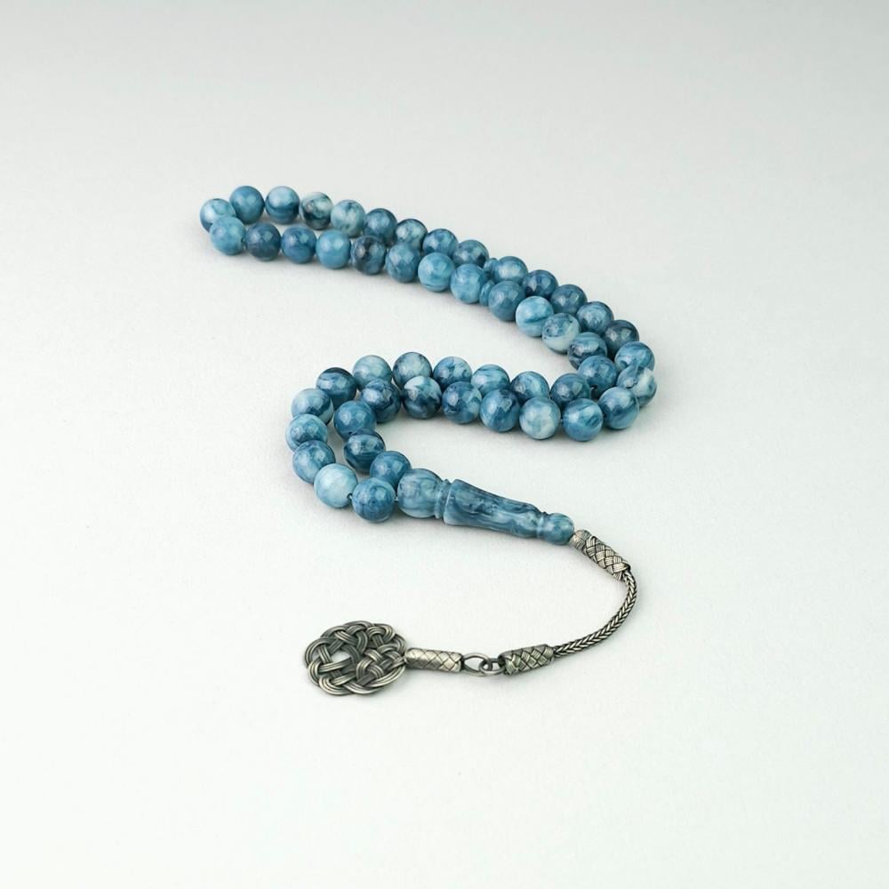 سبحة بكلايت خفيف الوزن مناسب للاستخدام اليومي بلون ازرق ين مما يضفي على المسبحة جمالا مييز. التقطيع الدائري متناسق مسباح ناعم باليد و يزينه طربزونة فضة اصلية انيقة .